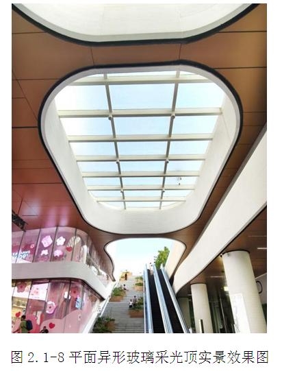 屋頂位置設置3個采光頂:1個單層網殼鋼結構玻璃采光頂,2個平面異形鋼結構玻璃采光頂。采光頂為玻璃及鋁單板組合,面板采用10+12Ar+8+1.52PVB(詞條“PVB”由行業大百科提供)+8mm中空三銀Low-E彩釉夾膠玻璃,龍骨采用焊接直角鋼龍骨,表面采用防腐底漆+防火涂料,鋼龍骨外側設置鋁合金底座轉接調節,排水方式為全隱無組織外排。(圖2.2.3.1-1~2)