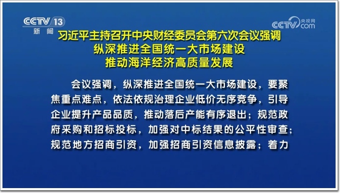 導(dǎo)語(yǔ):中共中央總書(shū)記、國(guó)家主席、中央軍委主席、中央財(cái)經(jīng)委員會(huì)主任習(xí)近平7月1日上午主持召開(kāi)中央財(cái)經(jīng)委員會(huì)第六次會(huì)議,研究縱深推進(jìn)全國(guó)統(tǒng)一大市場(chǎng)建設(shè)、海洋經(jīng)濟(jì)高質(zhì)量發(fā)展等問(wèn)題。