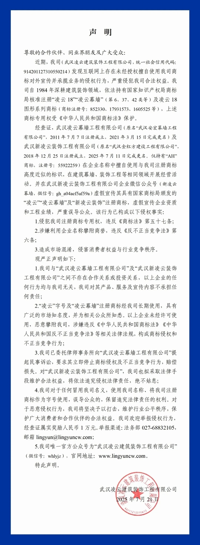 真正“墻”者——武漢凌云發布:打假聲明