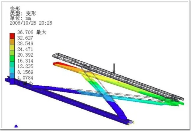 圖中顯示變形量達到36mm 之大!需要說明的是,因為所用軟件原因,筆者只能將平推鉸鏈作為一個整體零件來計算,考慮到實際五金其中各種鉚接處的縫隙及緩沖,實際變形量應該更大。