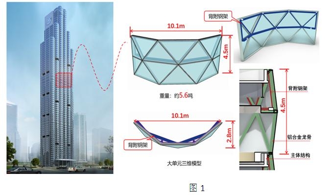 某總部大廈位于城市核心濱海地段,總建筑面積47.62萬㎡,建筑高388米。塔樓幕墻為多個空間三角型玻璃板組成,如同一顆顆鉆石,在陽光下熠熠生輝,是一座時尚現(xiàn)化代的高層辦公大樓。通過幕墻深化設(shè)計將多個空間異形三角玻璃互相插接的單元板塊設(shè)計組合裝配式超大單元板塊,板塊尺寸寬10.1米、高4.5米(見圖1),面積54平米,重量5.6噸。超大、超重、質(zhì)量要求高是本項目最大特點(見圖2),給工廠加工、板塊運輸、現(xiàn)場安裝帶來巨大挑戰(zhàn)。