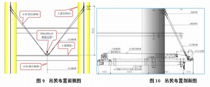 大板塊的尺寸為10.1米寬x4.5米高,重量為5.6噸。單個板塊面積大、重量大是其主要特點。先安裝在大板塊兩側(cè)的結(jié)構(gòu)柱位置板塊立柱為防風(fēng)軌道,再通過20噸卷揚機垂直吊裝幕墻超大板塊。卷揚機垂直分布在24F/45F/60F三個樓層,為減輕樓板負擔(dān),吊裝懸臂梁(詞條“懸臂梁”由行業(yè)大百科提供)端采用兩組斜拉直徑30mm的鋼絲繩與主體鋼柱連接固定。如圖8、9、10
