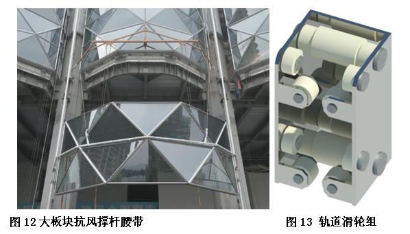 超大板塊垂直提升抗風(fēng)分析:單元板塊、兩道鋁合金工字鋁滑動軌道、滑輪(詞條“滑輪”由行業(yè)大百科提供)組及抗風(fēng)撐桿腰帶。大單元板塊通過主體結(jié)構(gòu)柱兩側(cè)反坎梁上的鋼連接件進行頂掛連接。利用大單元板塊兩側(cè)的V型板塊中立柱做為滑動軌道,抗風(fēng)撐桿腰帶一端與大板塊進行抱式連接,另一端通過滑輪組與豎向滑動軌道連接。抗風(fēng)系統(tǒng)將大板塊的風(fēng)荷載通過抗風(fēng)撐桿腰帶及滑輪組(圖13)傳遞給豎向滑動軌道,再通過V型板塊的三個掛接支點傳遞到土建結(jié)構(gòu)柱上,解決了超大板塊垂直提升過程兜風(fēng)擺動問題。整個系統(tǒng)安裝固定方式簡單,經(jīng)現(xiàn)場大面積安裝驗證,是安全可靠的。