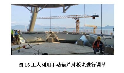 由于本項目板塊重量非常大,其安裝調(diào)節(jié)非常困難。因此板塊掛接時使用2個手動葫蘆,葫蘆一端掛在板塊兩側(cè)的吊點上,另一端掛在主體結(jié)構(gòu)上。板塊大致就位后,利用手動葫蘆來進行微調(diào),最終完成固定安裝。如