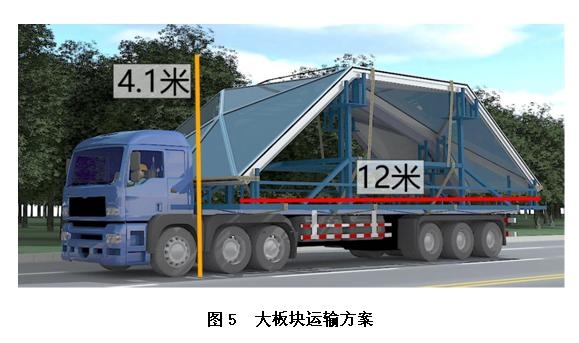 大板塊寬4.5米屬于超寬板塊,采用13米運輸車進行運輸,每車運輸1塊大板塊,運輸全程采用大板塊胎架進行有效保護。大板塊尺寸超寬,只能在夜間利用大型貨車進行材料的運輸,避開車流高峰,且需提前向交通運輸相關(guān)部門申請通行證。如圖5