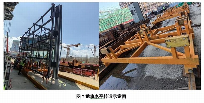 由于南面位置場地狹小無法將大板塊運輸車輛直接駛?cè)耄易鰹橹黧w鋼結(jié)構(gòu)作業(yè)范圍,汽車吊沒有作業(yè)位置,大板塊水平轉(zhuǎn)運采用地面軌道進行轉(zhuǎn)運。軌道采用20號工字鋼,寬度3米,水平轉(zhuǎn)運過程操作便捷、安全可靠,滿足大板塊的水平運輸要求,實現(xiàn)了超大板塊的現(xiàn)場水平轉(zhuǎn)運。安裝完成后,胎架沿地面軌道水平轉(zhuǎn)運至汽車吊位置,利用汽車吊吊裝實現(xiàn)超大板塊胎架的存放和返廠。如圖7