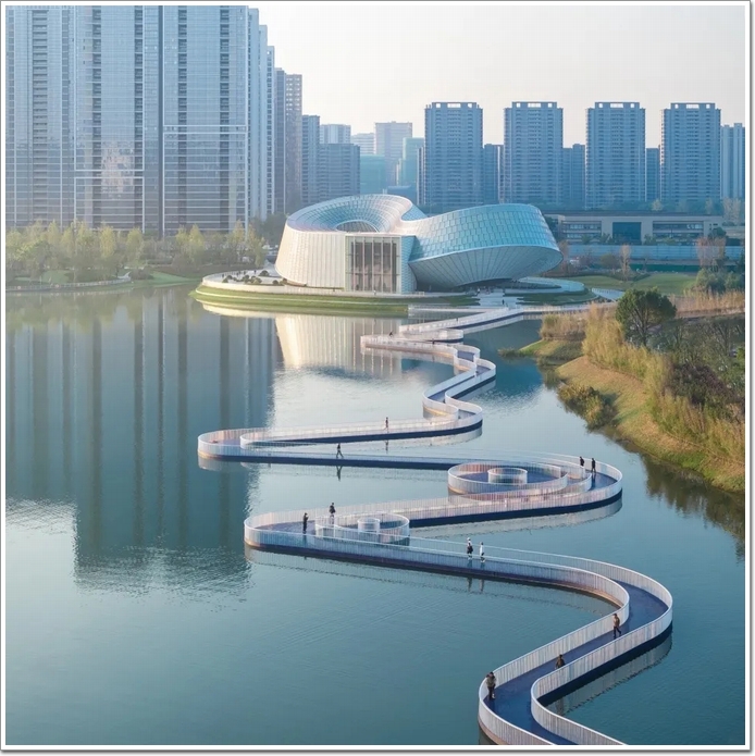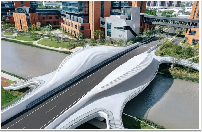 上海浦東新區(qū)鶴鳴橋長145m、寬20m,設(shè)計以“曲水江南•流云金灣”為題,取江南曲線、戲曲韻律,融歷史、產(chǎn)業(yè)、景觀于一體;與北步行橋聯(lián)動,串聯(lián)兩岸綠地,兼顧交通、形象、休閑、打卡,打造金灣地標(biāo)。