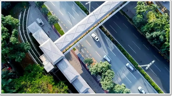深圳水圍天橋獨柱傘狀鋼結(jié)構(gòu)打破視野局限,預(yù)制裝配技術(shù)與雨水回收系統(tǒng)實現(xiàn)綠色施工,三角梅長廊與無障礙電梯詮釋人文關(guān)懷,這座連接皇崗公園與社區(qū)的藝術(shù)品,重新定義了城市慢行體驗。