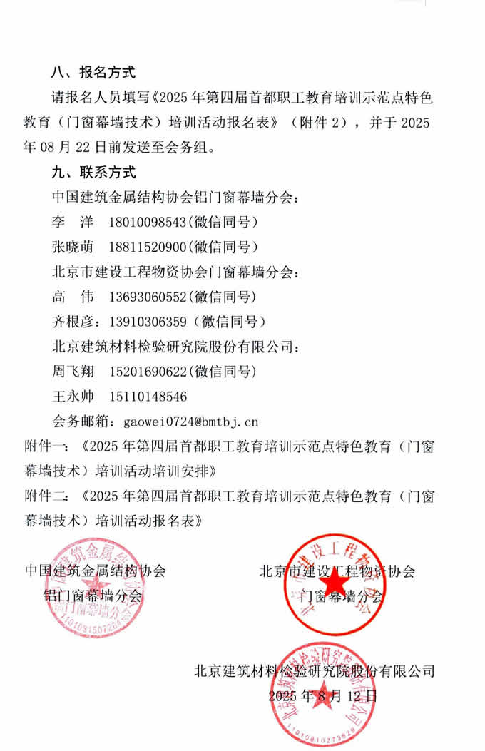 請報名人員填寫《2025年第四屆首都職工教育培訓示范點特色教育(門窗幕墻技術)培訓活動報名表》(附件2),并于2025年08月22日前發送至會務組