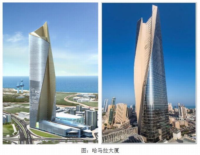 大廈距離波斯灣海僅1公里,是科威特第一高樓。外立面造型為半蜷曲狀,非對(duì)稱結(jié)構(gòu)式結(jié)構(gòu)。幕墻形式包含大面積的淺灰色隱框單元體幕墻、弧形扭曲單元玻璃幕墻、復(fù)雜造型不銹鋼雨棚等等。其中干掛石灰石幕墻的的建筑高度達(dá)到400米。