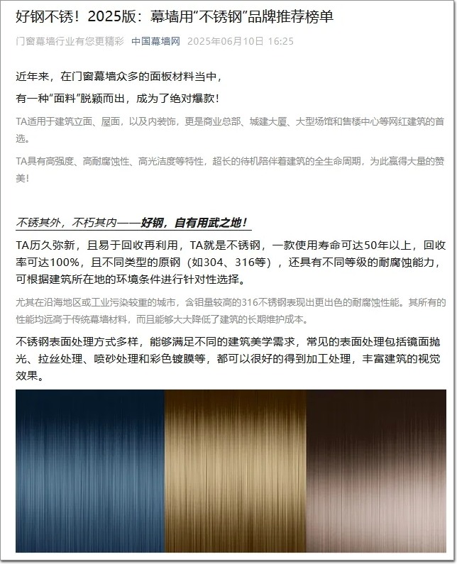 熱忱歡迎廣大門窗幕墻行業優秀的“不銹鋼”品牌企業積極報名,并提交資料,參與到中國幕墻網ALwindoor.com組織開展的品牌推薦活動中。