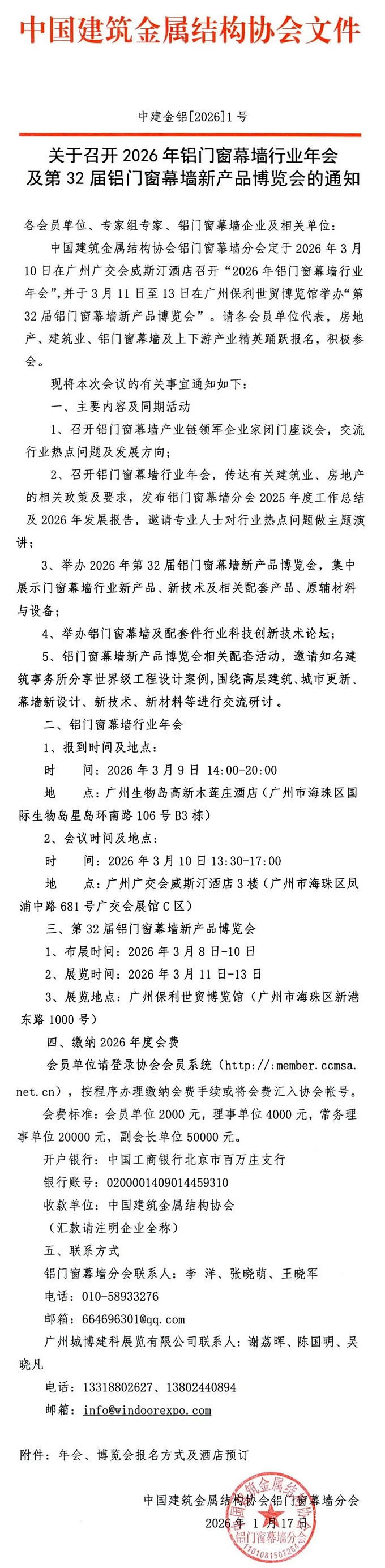 中國建筑金屬結構協會鋁門窗幕墻分會定于2026年3月10日在廣州廣交會威斯汀酒店召開“2026年鋁門窗幕墻行業年會”,并于3月11日至13日在廣州保利世貿博覽館舉辦“第32屆鋁門窗幕墻新產品博覽會”。請各會員單位代表,房地產、建筑業、鋁門窗幕墻及上下游產業精英踴躍報名,積極參會。