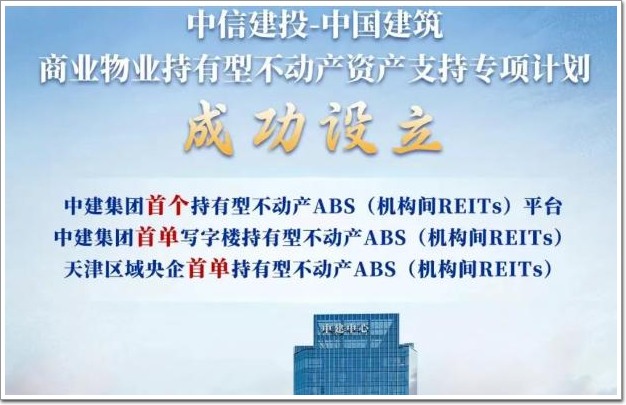 此次在上交所設立的“中信建投—中國建筑商業物業持有型不動產資產支持專項計劃”,以中建六局旗下中建地產(天津)有限公司的中建中心寫字樓物業為標的資產,中建集團財務資金部統籌,中建六局(中建絲路)、中建資本聯合實施。