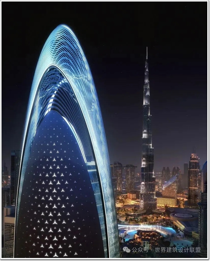項目位于迪拜市中心,靠近哈利法塔,建筑高度341米,共65層,其獨特的橢圓形輪廓仿佛一艘穿越時空的太空飛船。