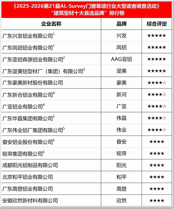 榜單由來(lái)自“TOP10”鋁型材企業(yè)、“TOP10”幕墻企業(yè)、“TOP10”門窗企業(yè)為代表的材料、成本負(fù)責(zé)人,針對(duì)產(chǎn)品質(zhì)量\服務(wù)水平的維度進(jìn)行評(píng)審、打分。同時(shí),匯總來(lái)自行業(yè)專家、省市協(xié)會(huì)從品牌價(jià)值\業(yè)界口碑,以及綜合設(shè)計(jì)院、顧問公司對(duì)其技術(shù)創(chuàng)新\解決方案的評(píng)價(jià)。