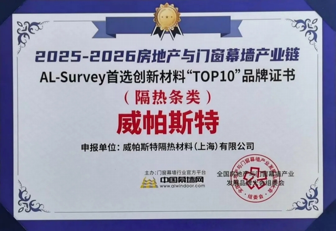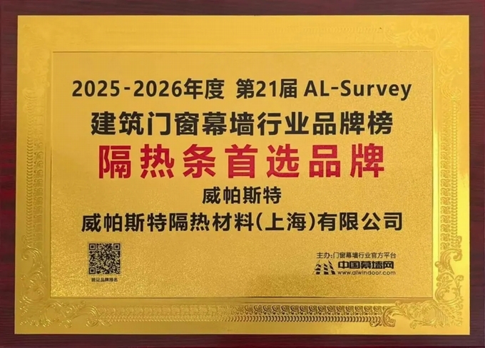 在備受矚目的 “2025-2026第21屆AL-Survey門窗幕墻行業(yè)大型讀者調(diào)查活動(dòng)” 中,經(jīng)過千萬讀者線上投票及評(píng)審委員會(huì)嚴(yán)格核定:威帕斯特榮登“隔熱(詞條“隔熱”由行業(yè)大百科提供)條首選品牌”排行榜(進(jìn)口品牌)第二位!
