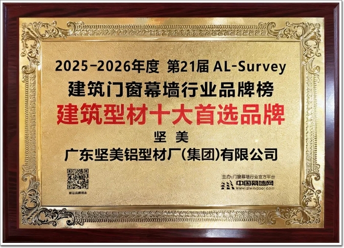 在展會開幕前夕舉行的第21屆中國門窗幕墻行業TOP品牌榜評選中,堅美鋁業憑借卓越的產品品質和良好的市場口碑成功入選。在展會首日的2026房地產與門窗幕墻發展大會暨TOP品牌盛典中,堅美獲頒“建筑型材十大首選品牌”,連續第11年蟬聯該殊榮。這一榮譽不僅是對堅美長久以來堅持匠心品質的認可,更是堅美品牌市場影響力的生動體現。