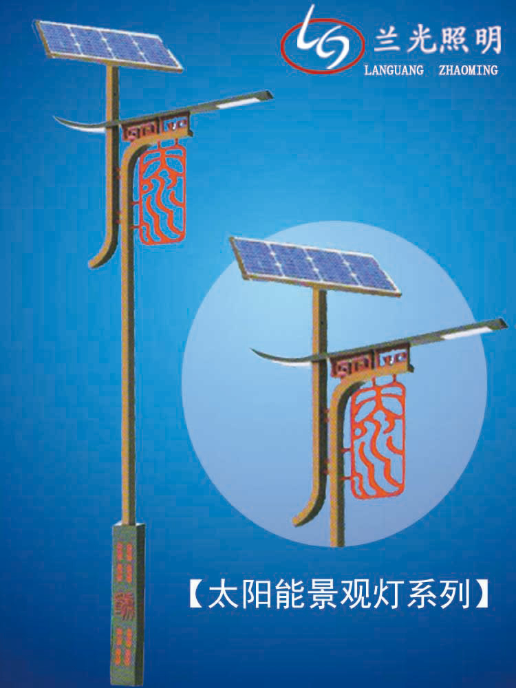 蘭光照明太陽能景觀燈是城市園林景區、文化休閑娛樂廣場及大型社會活動場所普遍使用卻必不可少的裝飾光源配置形式。是裝飾型照明燈飾產品,燈桿材質多樣,光源運用靈活多變,聲、光、電三位一體,結構形式千姿百態,是美化,亮化,綠化有機結合,光與影,燈與藝術的完美結晶。