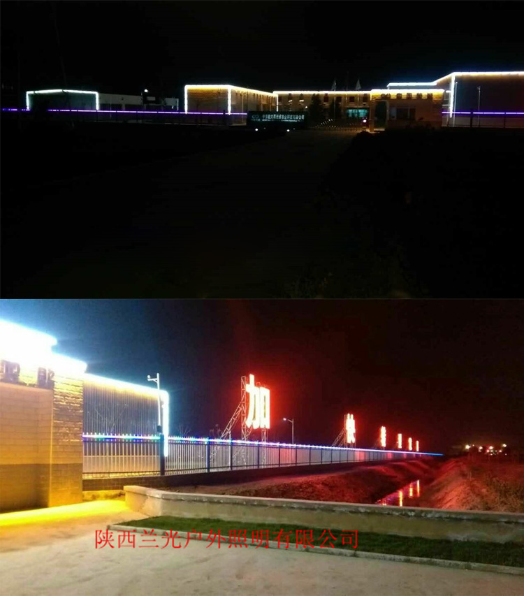 簡介—— 中節能大荔光伏農業科技有限公司廠區亮化項目,是我們陜西蘭光照明2015年承接的亮化工程。公司設計師根據廠家要求簡單實用的特點,整個廠區的設計全部采用線條燈和輪廓燈,將整個廠區的廠房、大門、廠區道路、辦公樓以輪廓勾勒的形式展現出來,照亮整個廠區,達到客戶廠區樓宇亮化需求。