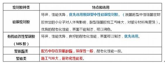 目前市面上,室內裝飾接縫用密封膠中常見的本體型密封膠有:有機硅類(硅酮膠、MS膠)、聚氨酯類、聚硫類等。對于這些密封膠,又該如何選擇呢?從綠色環保的角度,我們建議參照如下的選用原則選擇密封膠:表4 常見的本體型密封膠的選用原則