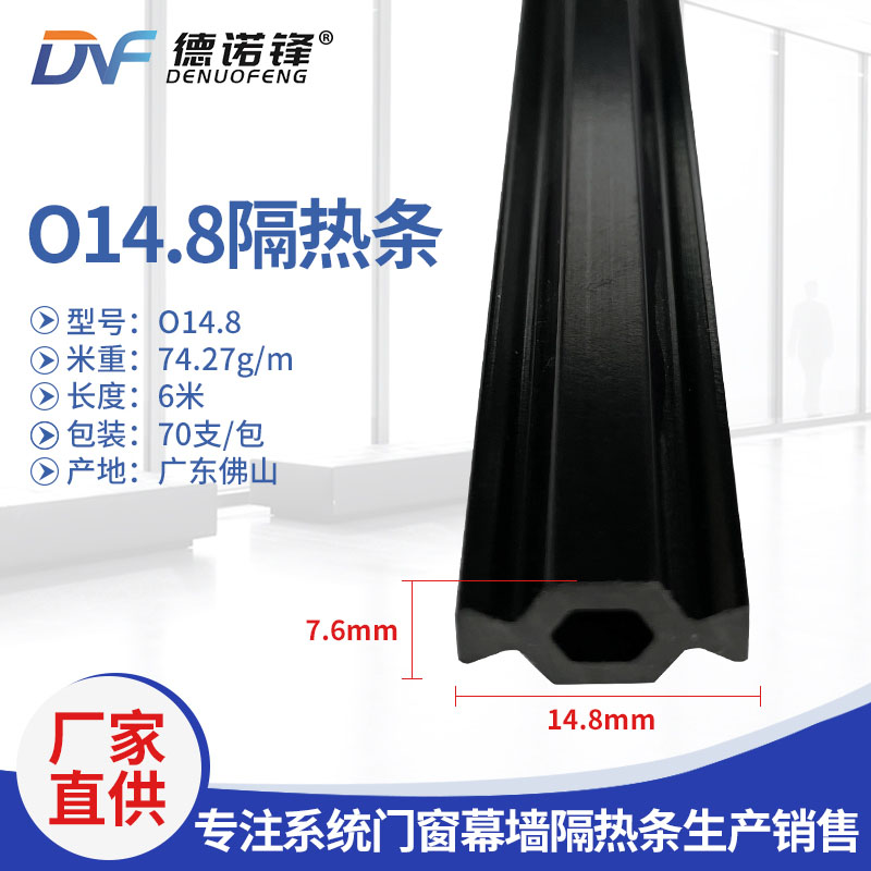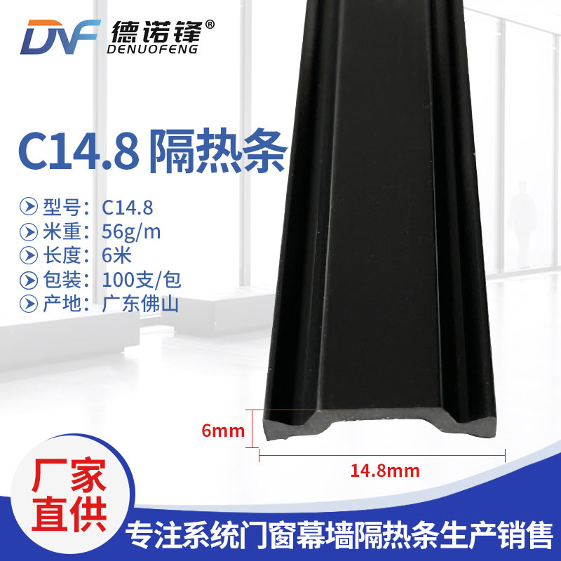 • 德諾鋒成立于2009年,總部坐落在美麗富饒的鋁材大鎮--佛山大瀝鎮。公司主要生產PA66GF25隔熱條及原料研發,是一家集設計,研發,生產,銷售為一體的企業,擁有現代標準化廠房2萬平方米,隔熱條生產線80多條,年產2億多米。公司生產的隔熱條主要原材料直接從美國采購,生產隔熱條經國家專門檢測機構認證,隔熱條各項指標均達到JT/174-2005行業標準和GB/T23615.1-2009國家標準要求,同時榮獲ISO9001:2008質量管理體系認證?估瓘姸扰c尺寸精度等隔熱條重要指標均達到國家先進水平。隔熱條質量優良,規格齊全,價格合理,同時也竭誠為顧客提供特型隔熱條訂做服務。公司擁有一批高素質管理和技術人才,配套高精級的隔熱條生產線等機械設備,采用先進的生產工藝,公司全面推動系統化,進程化,數據化,信息化的管理方式,滿足顧客的需求。