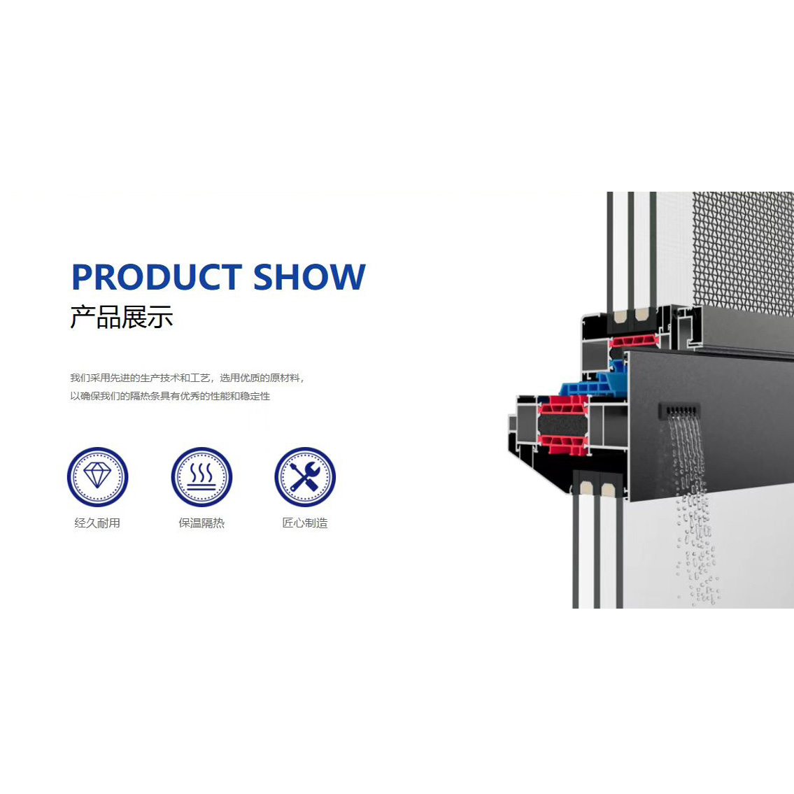 二、抗老化不變形,保證在陽光暴曬及嚴寒冷凍狀況下隔熱條與鋁材持久、緊密結合。