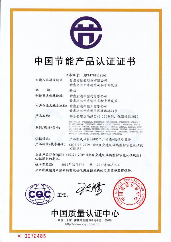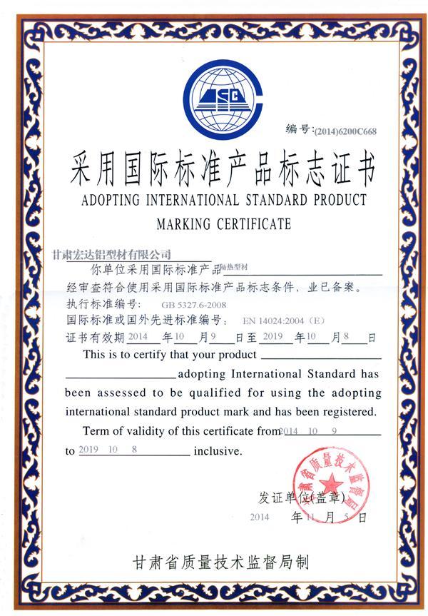 證書名稱: 采用國際標準產(chǎn)品標志證書-隔熱型材