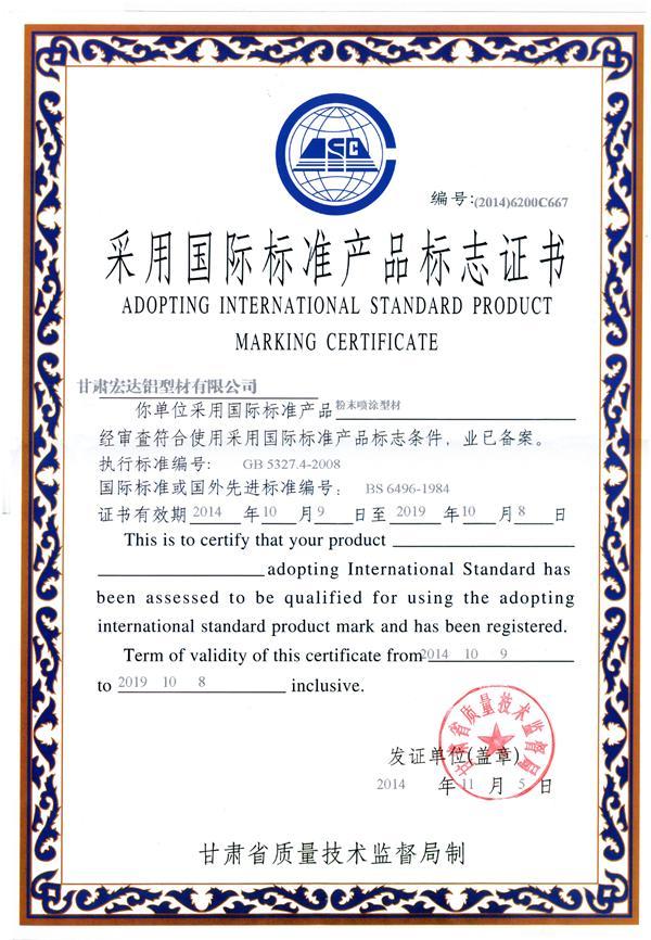 證書名稱: 采用國際標準產(chǎn)品標志證書-粉末噴涂型材