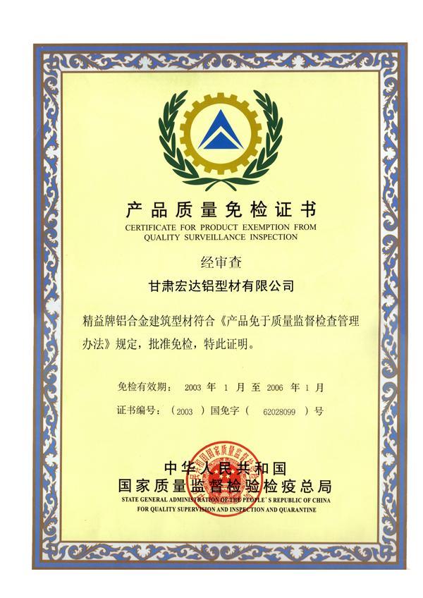 證書名稱: 產(chǎn)品質(zhì)量免檢證書