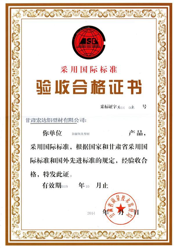 證書名稱: 采用國際標準驗收合格證書-陽極氧化型材