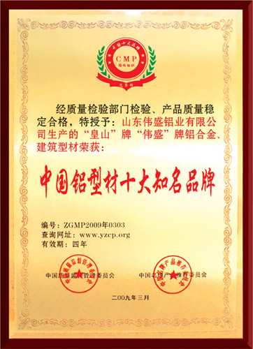 證書名稱: 中國鋁型材十大知名品牌