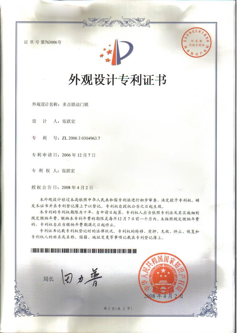 證書名稱: 多點(diǎn)聯(lián)動聯(lián)動門鎖