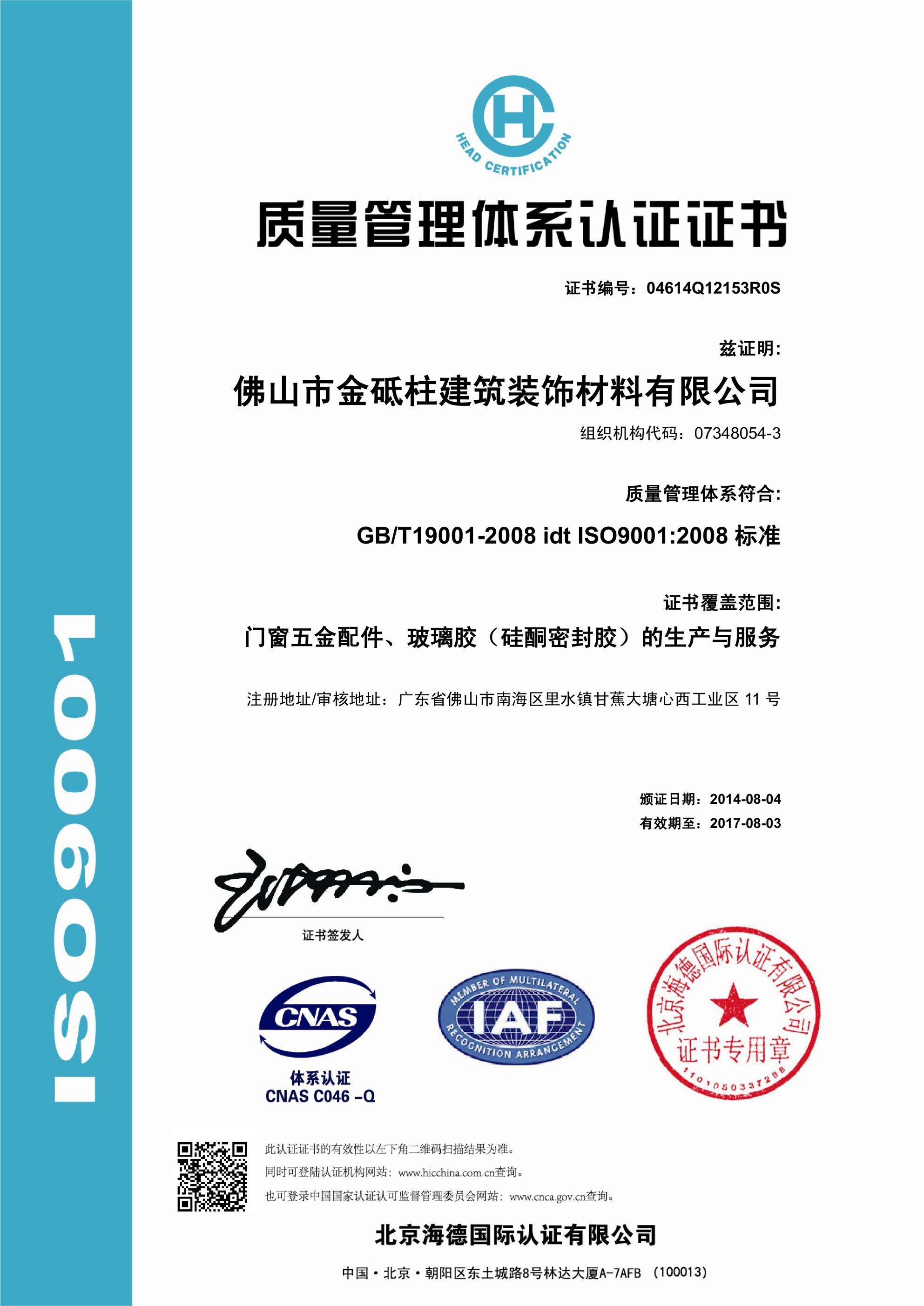 證書名稱: SO9001國際質量體系保證