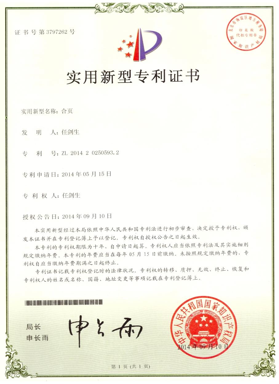 證書名稱: 合頁專利證書