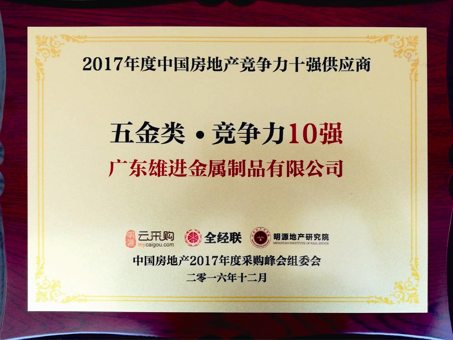 證書名稱: 2017年度中國房地產競爭力十強供應商五金類