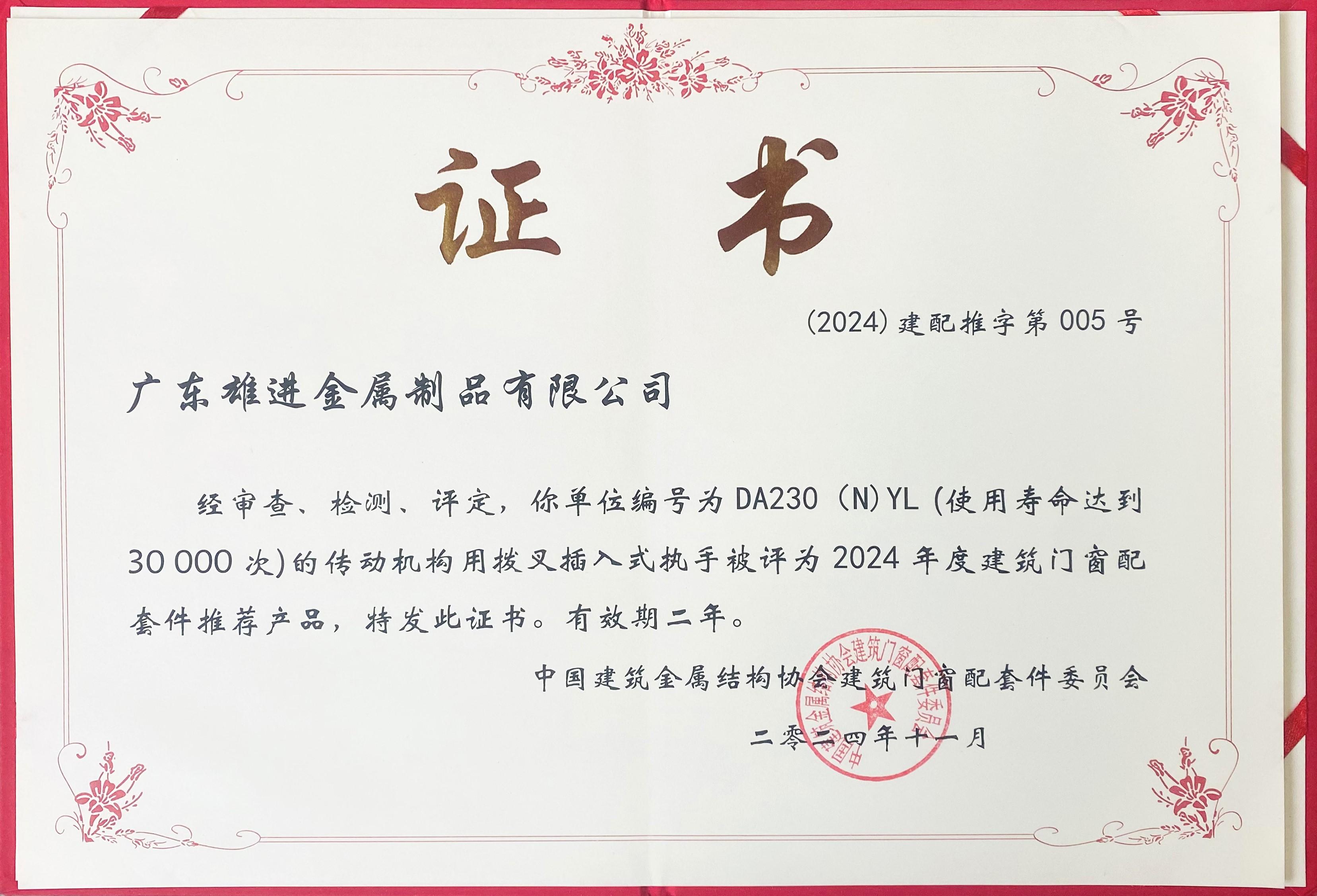 證書名稱: 中國建筑金屬結構協會建筑門窗配套件推薦產品DA230(N)YL