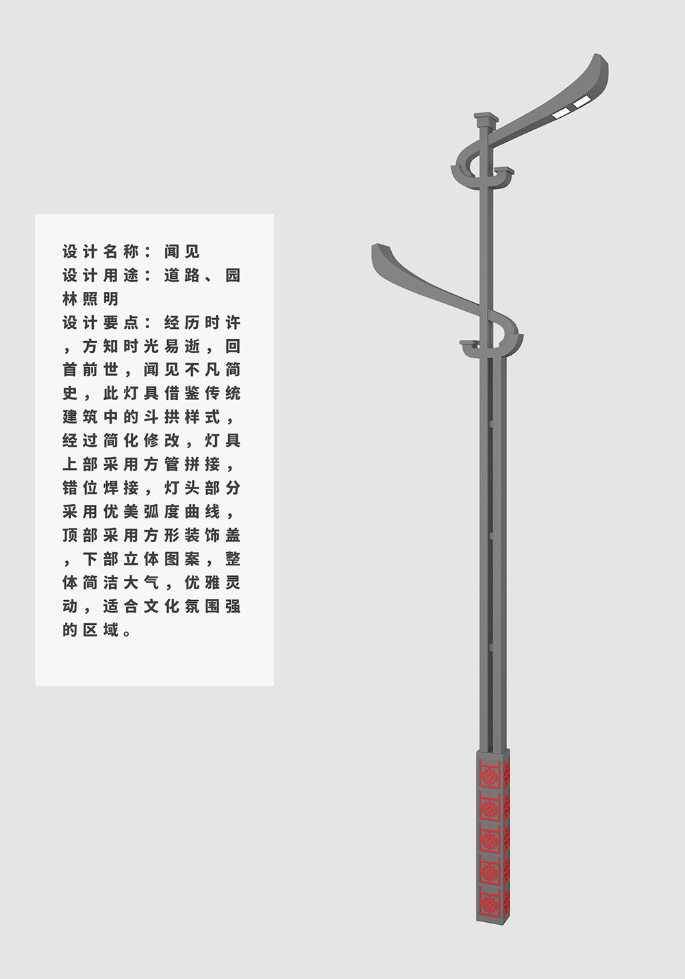 設計要點:經歷時許,方知時光易逝,回首前世,聞見不凡簡史,此燈具借鑒傳統建筑中的斗拱樣式,經過簡化修改,燈具上部采用方管拼接,錯位焊接,燈頭部分采用優美弧度曲線,頂部采用方形裝飾蓋,下部立體圖案,整體簡潔大氣,優雅靈動,適合文化氛圍強的區域。