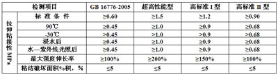 硅酮結構膠要長期(十幾年甚至幾十年)承受紫外線照射、臭氧、濕氣等氣候老化;還要長期承受風荷載、重力荷載以及溫差和結構變形引起的內應力,因此對其最重要的性能是拉伸強度、粘結性及耐老化性能,對彈性有一定的要求。我國國家標準GB 16776-2005《建筑用硅酮結構密封膠》對硅酮結構膠的這些重要性能做出了要求,性能指標如下表所示。