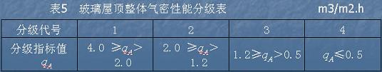 玻璃屋頂整體(含開啟部分)采用壓力差為10Pa時的單位面積空氣滲透量qA作為分級指標,分級指標應符合下表的規定。