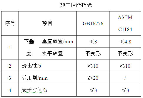 密封膠的施工性能表征了產品的使用性能,是施工應用的關鍵性指標,直接關系到施工操作時的便捷性。良好的施工性能,可以有效保證施工過程的速度及效率;而不良的施工性能不僅造成操作困難,也容易發生施工質量缺陷。在硅酮結構膠的施工性能指標方面,國標GB16776與美標ASTM C1184標準中,均對現場施工相關的流動性、擠出性、表干時間、適用期等性能指標進行了規定,評價要求基本一致,其中GB16776個別指標要求比ASTM C1184要相對嚴格,具體對比見下表。