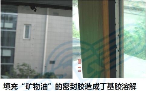 d:與充油膠接觸,例如幕墻接縫的耐候膠或門窗密封膠,充油膠里面的礦物油會滲透擴散;透過二道密封膠溶解丁基膠。解決方法:幕墻耐候膠或者門窗膠不能使用填充礦物油的硅酮密封膠。