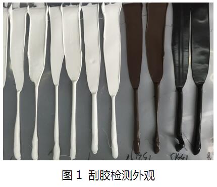 把膠打成膠條,立即進行刮膠,觀察外觀(如圖1)。刮膠后目視如發現有較為密集的顆粒,或發現了直徑超過0.5mm的顆粒、膠皮,已影響到密封膠的外觀,那么我們認為膠自身外觀有問題。