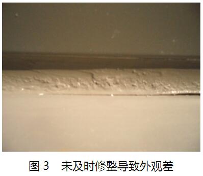 2) 注膠后未及時修整,時間間隔過長。注膠后時間過長,膠表面已部分結皮半固化,這時再修整表面導致出現粒狀的膠皮。如圖3: