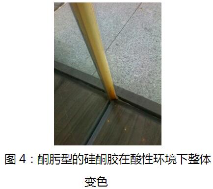 另外還有一種情況,酮肟型的密封膠在酸性環境下,會發生整體變色。比如酮肟型的密封膠膠條旁邊打一段酸性密封膠膠條,一段時間后,就會出現變色。圖4是酮肟型的密封膠在室內裝飾的酸性環境下出現了整體變色,同時,我們在室外發現該密封膠沒有變色。