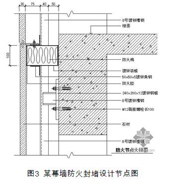 建筑幕墻一般應用在人群密集的大型公共建筑或重要的高層、超高層建筑外墻上,其火災危險性較大。這是因為一般幕墻用玻璃、石材、復合鋁板均不耐火,受熱或遇火燒時易變形、破碎,造成幕墻大面積掉落,同時火焰會從幕墻破碎洞口的外側卷進上層室內。此外,玻璃、石材是脆性材料,溫度達到250℃時玻璃即會炸裂,造成安全隱患。垂直幕墻與建筑物各樓層樓板、房間間墻間的縫隙,也是火災發生時煙火擴散的途徑。由于建筑構造的要求,在幕墻和樓板之間均留有較大的縫隙,若不對其進行密封處理或密封處理不當,煙火就會由此向上擴散,造成蔓延。為提高幕墻的耐火極限,延長幕墻抵御火災的時間,阻止火災發生時煙火擴散,盡量減少火災帶來的損失,幕墻與其周邊防火分隔構件間的縫隙、與樓板或隔墻外沿間的縫隙、與實體墻面洞口邊緣間的縫隙等,均應進行防火封堵設計。