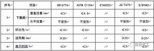 在硅酮結構密封膠的施工性能指標方面,中國GB/T16776、JG/T475、美國ASTM C1184標準中,均對現場施工時經常涉及的流動性、擠出性、表干時間、適用期等性能指標進行了規定,評價要求基本一致。