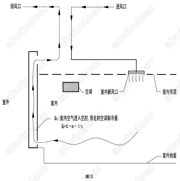 直排式內(nèi)循環(huán)雙層幕墻在夏季室外炎熱高溫時,室內(nèi)要達到舒適的溫度環(huán)境,通常采用空調(diào)制冷降溫,如圖。按直排式內(nèi)循環(huán)雙層幕墻的空氣循環(huán)路線可以看到,室內(nèi)被空調(diào)降溫的空氣在排出室外的過程中帶走了空調(diào)的制冷能量。夏季室外高溫空氣作為新風進人室內(nèi)時不得不增加空調(diào)的負荷,所以直排式內(nèi)循環(huán)雙層幕墻在夏季與其它選用相同玻璃配置的幕墻在傳熱系數(shù)方面相比不但沒有優(yōu)勢,它還增加了空調(diào)的負荷,所以從傳熱角度來說沒有道理說它節(jié)能。但從遮陽的角度考慮,雙層幕墻由于設(shè)置了遮陽簾系統(tǒng),所以通過遮陽起到一定的節(jié)能作用。